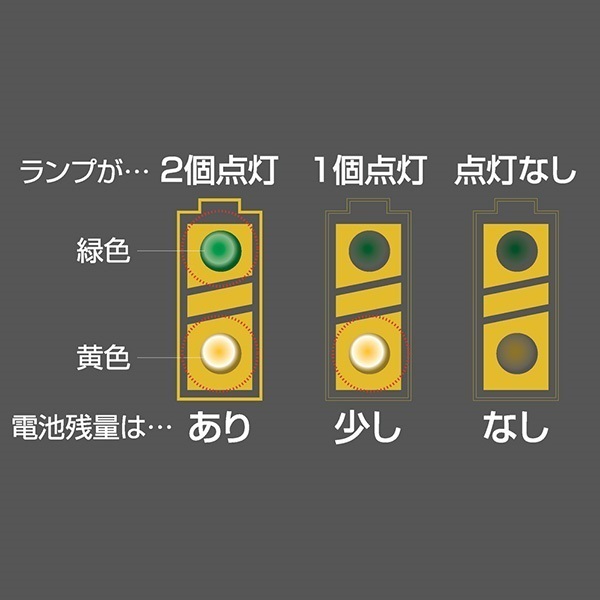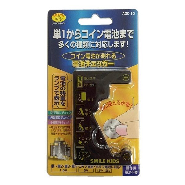 スペック(仕様) サイズ表 在庫情報 [サイズ] 幅5.7cm×高さ9.2cm×奥行1.3cm[重さ] 26g[材質] ABS樹脂[測定可能電池] 単1・単2・単3・単4乾電池、ボタン型酸化銀電池(SRタイプ)、アルカリボタン電池(LRタイプ)、コイン型リチウム電池(CRタイプ)■ 動作用電源不要■ LEDランプで残量表示 注文可