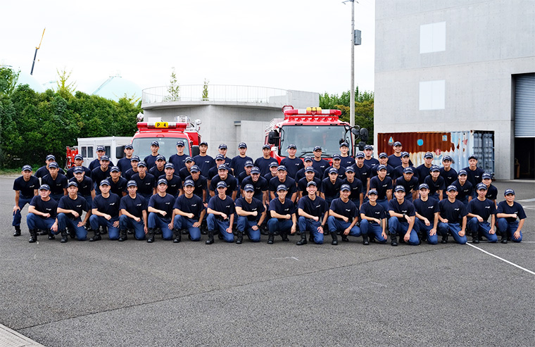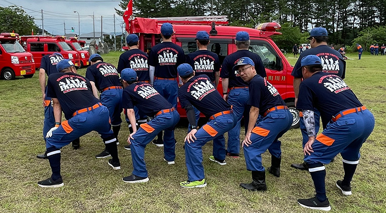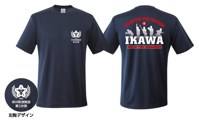 ポンプ操法大会での着用になるので町の名入れと操法のシルエットがアピールポイントです。
