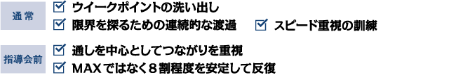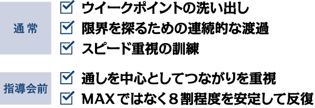 牛久指導会まで余裕のある時期はスピード重視の訓練もしますが、本番が近づくと常に普段どおりの力を出せることを主眼に置いて訓練します。 - 自分流の調整方法などは?