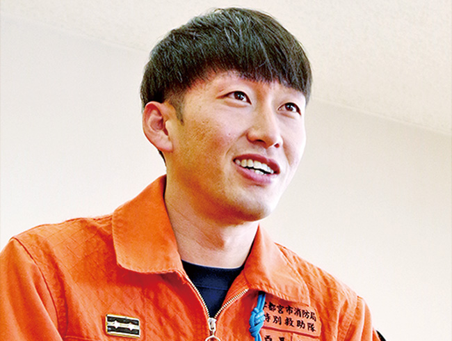 千代 大斗消防副士長 - 第50回関東地区指導会に基本泳法で出場し、全国大会にも出場した。今年度は溺者救助でさらに上をめざす。