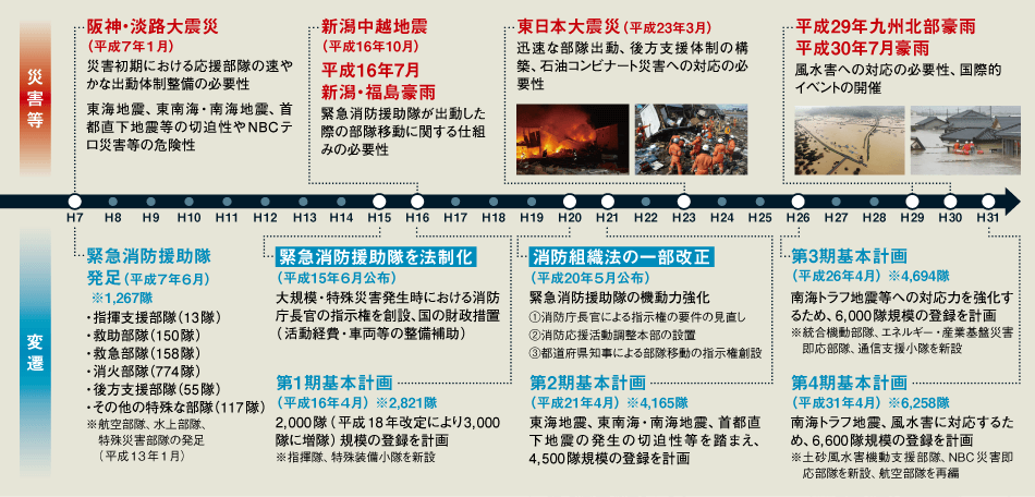 25年前に起きた阪神・淡路大震災の教訓を糧にし、平成7年6月に創設された全国消防機関相互による援助体制「緊急消防援助隊」は、大規模災害等で被災した都道府県内の消防力のみでは対応が困難な場合に、被災地からの要請等により迅速に出動し、救助活動を展開する。