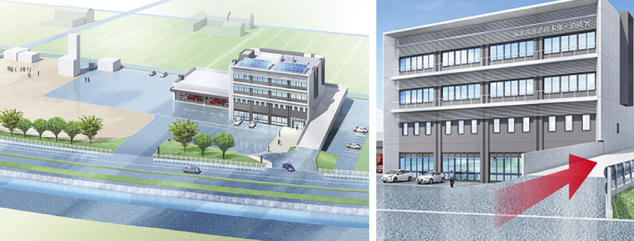 完成予想パース。津波の襲来時は消防車両をスロープを使って車庫屋上部分へ退避させる。庁舎の主要機能は2階以上に集約。