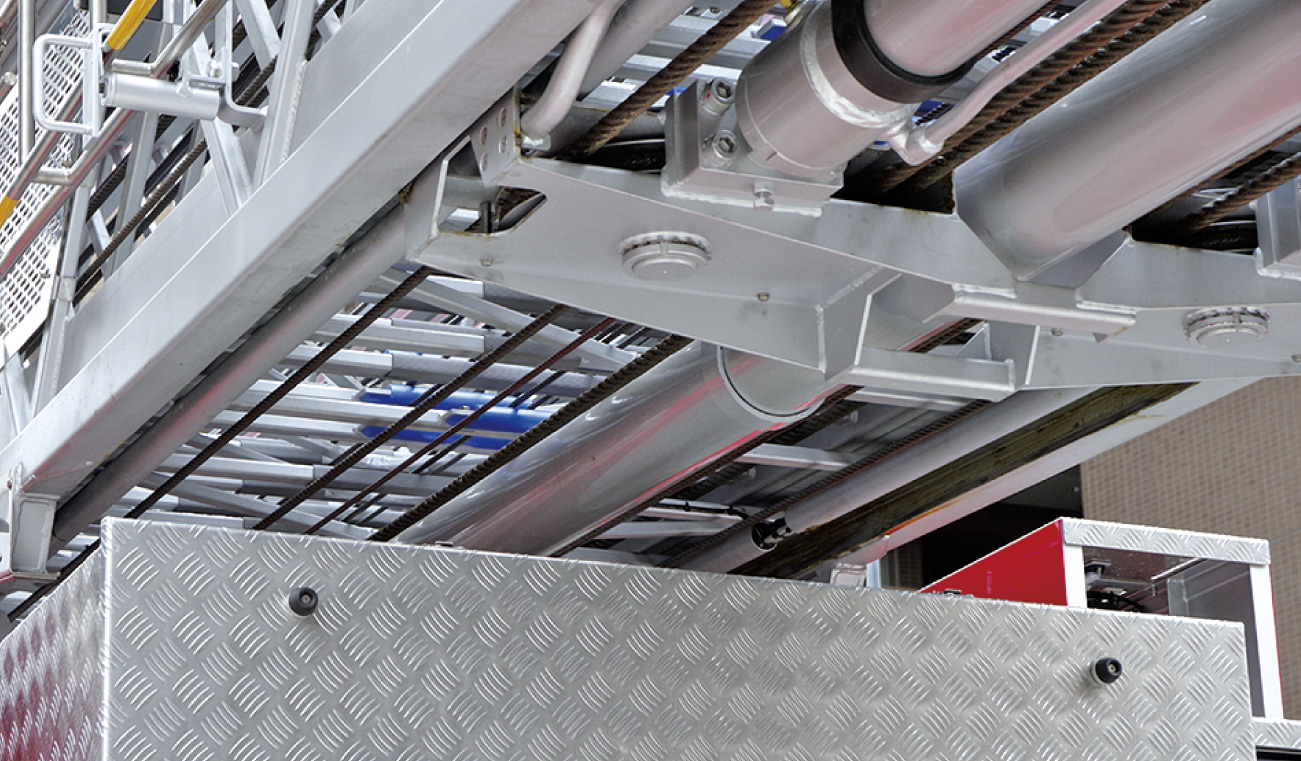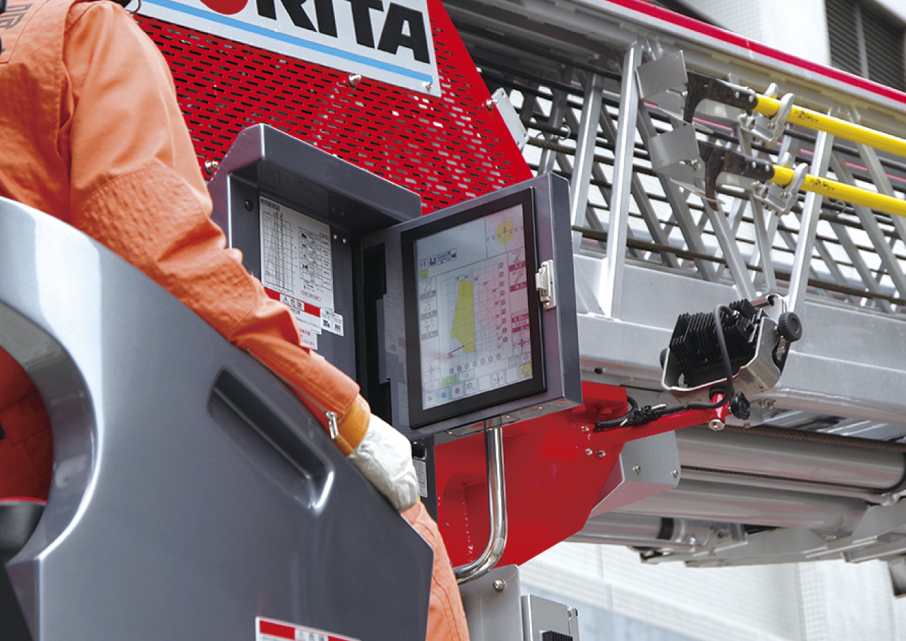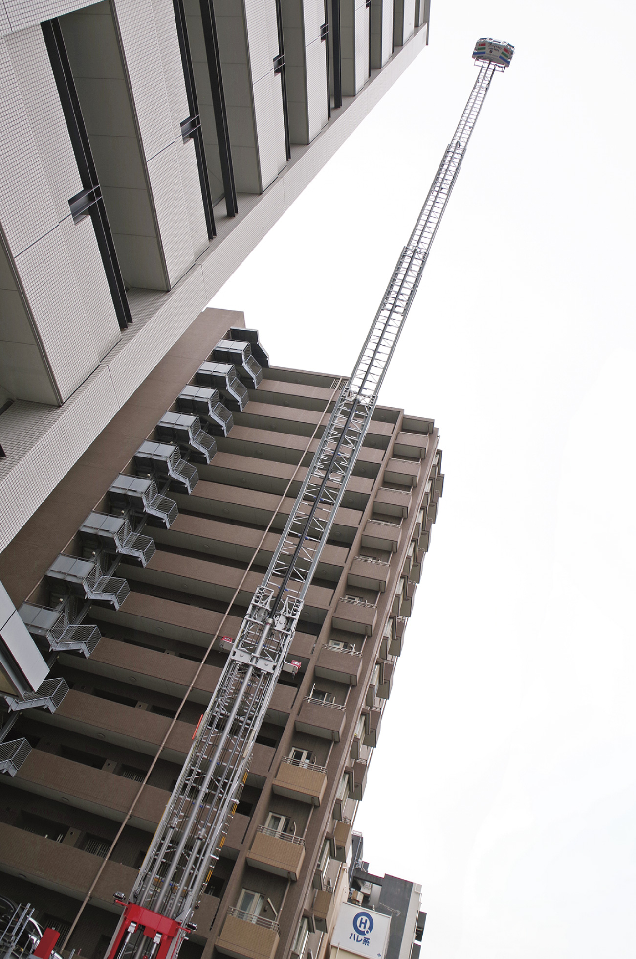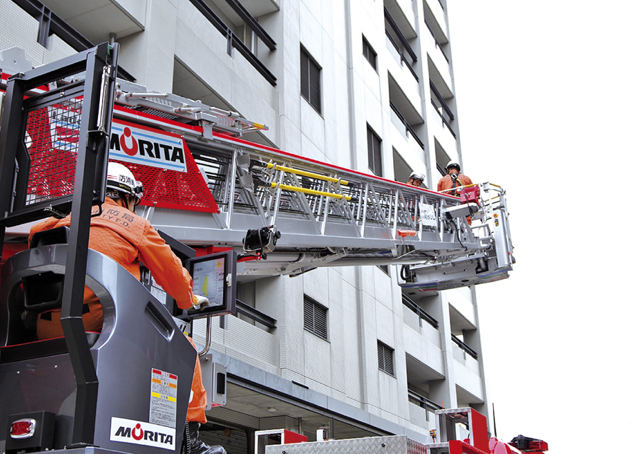 はしごをいっぱいまで伸ばすと9階建庁舎(軒高36.25m)に届く高さ。なお、庁舎にはさらにその上にヘリポートが設置されている(最高高さ50m)。梯体の伸長はスムーズでバスケットの動揺も最小限。