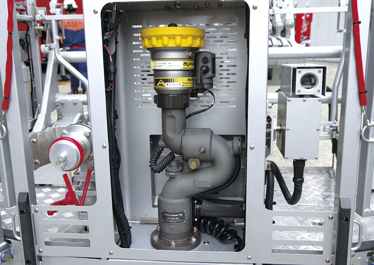 バスケット前面に取り付けられた放水砲(写真左上)。コンビナート火災に対処するため、毎分3,000ℓの大量放水能力を備える。同じくバスケットからのカメラ映像は遠隔での状況確認に活用可能(写真右下)。