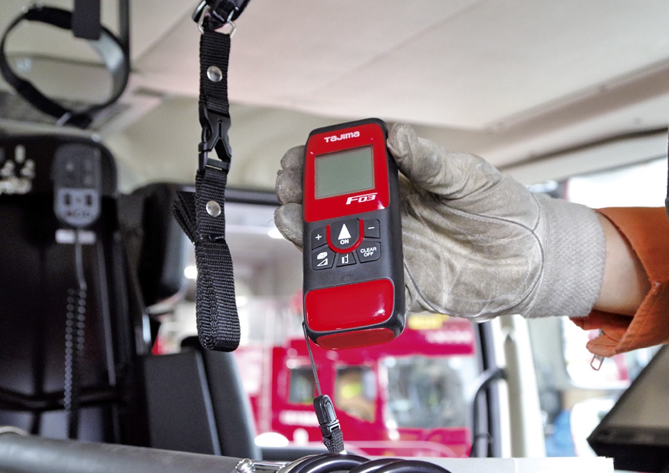 レーザー距離計は建物までの距離を計測する。