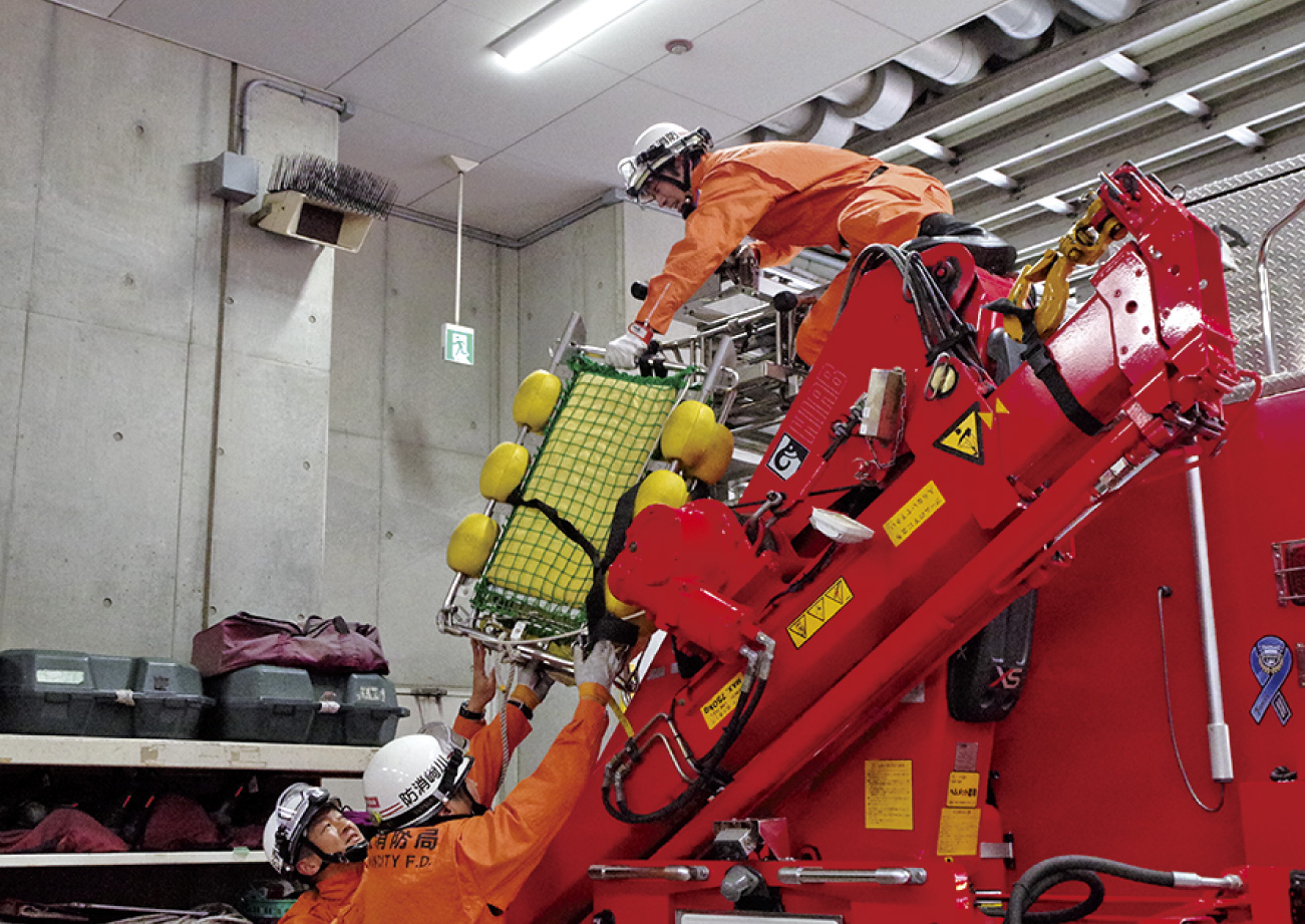 川崎消防署に新しく配備されたはしご車のはしご最大地上高は40m。狭隘な都市部に配備されるはしご車は災害場所へのアプローチを考慮した30mクラスが多いなか、あえて大型の40mとしたのは、コンビナート火災において石油タンク上方からの高所放水も想定しているのが理由。