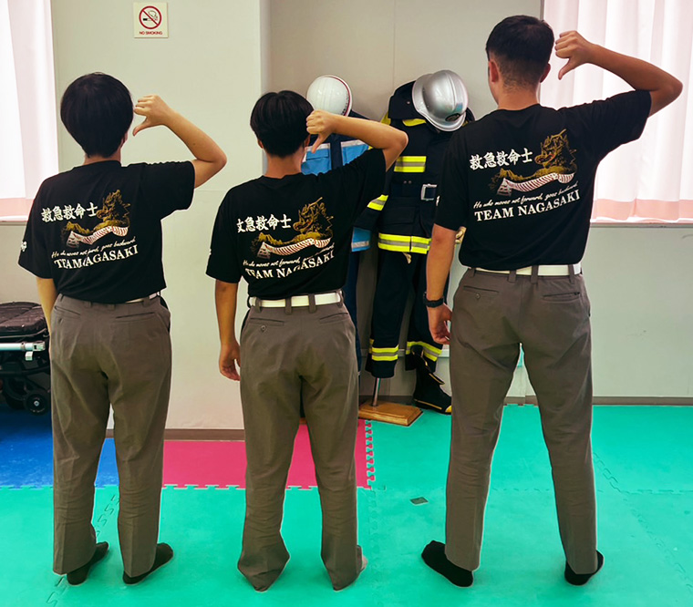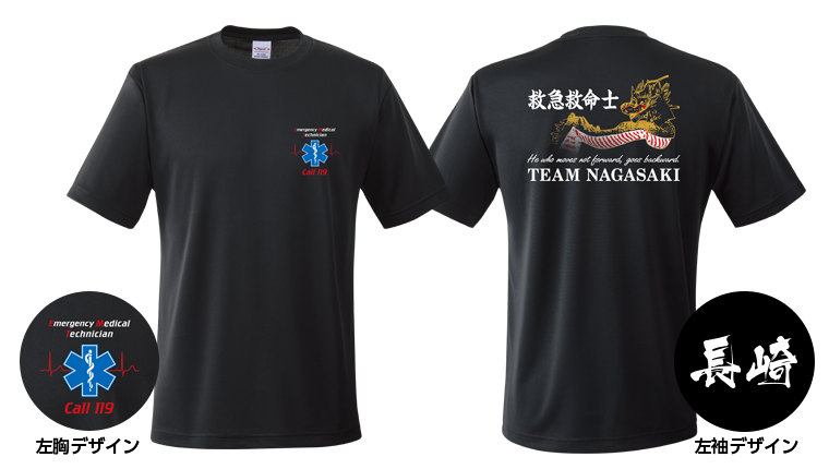 背面のデザインは特徴的で迫力満点にしたかったので、長崎の伝統行事「長崎くんち」蛇踊りの大蛇をイメージしました。左胸のデザインは救命のシンボルマーク「スターオブライフ」をメインとし、その両サイドに心拍動を表すQRS波形をつけました。