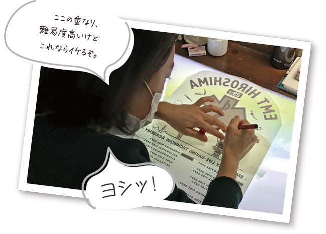 デザイン案が決定したら、今度は製版用データとして分解していきます。美しく効率的にプリントできる刷り順を考慮し、製版用フィルムを実寸加工します。