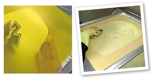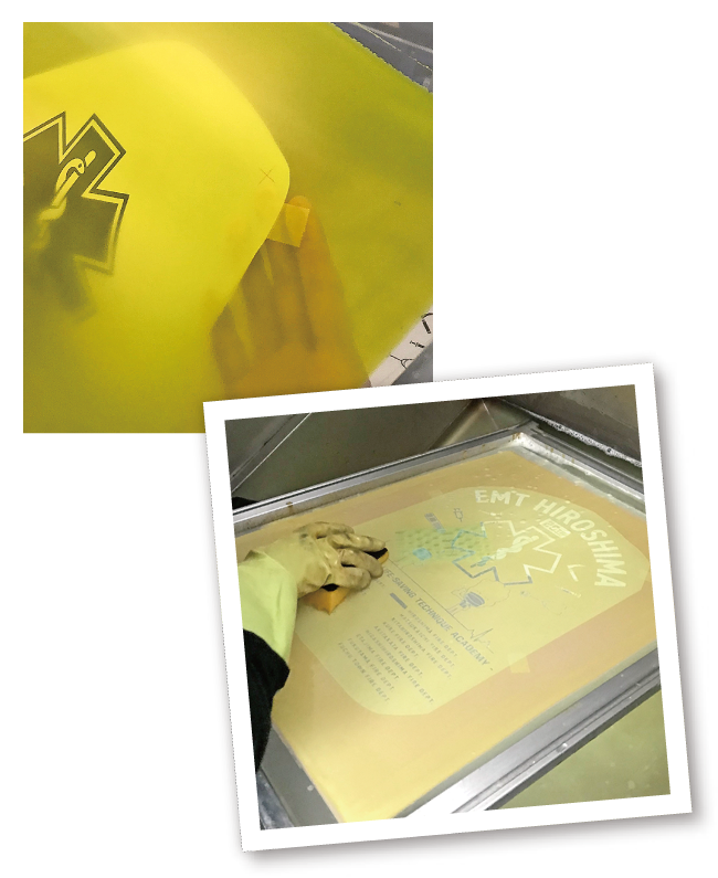 暗室で版焼き。色数やプリント箇所にあわせて複数の版を準備していきます。それぞれの版を重ね刷りしたときにズレが発生しないよう、何度もフィルムをチェックしながら製版していきます。