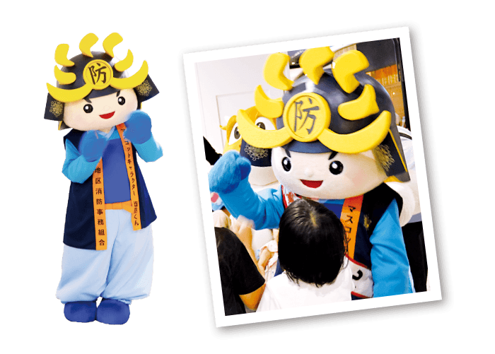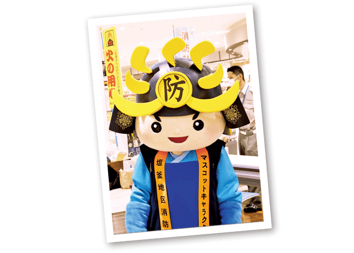ぼくの兜はさ、管轄する塩竈市、多賀城市、松島町、七ヶ浜町、利府町の5カ所が「人」という字の周りを囲むデザインになっているの、わかるかな?これ、防災の「災」のなかに、「この地域の人を守る」という意味合いを込めているんだよ。かっこいいでしょ!